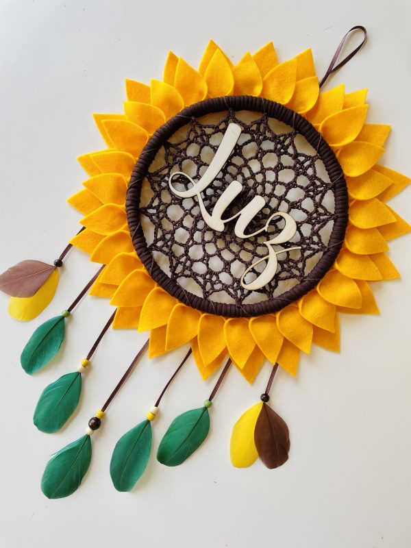 Atrapasueños en forma de Girasol pétalos de fieltro tejido a crochet en forma de mándala con hilo de algodón.